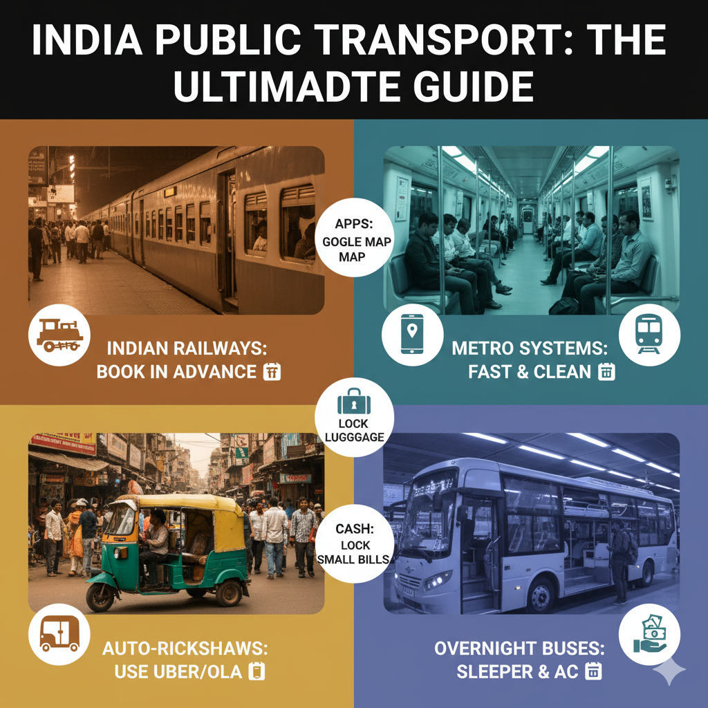 India’s transportation network is the pulsing heart of the nation—a system as complex, diverse, and vibrant as the country itself. To truly explore India is to surrender to the movement of its railways, the rhythm of its buses, and the chaotic charm of its local rickshaws. Mastering this network is the key to cost-effective travel, deep cultural immersion, and seamless navigation across the subcontinent.While the sensory overload of a packed train station or a bustling bus depot can initially be intimidating, a little preparation turns these necessities into some of your most authentic and memorable travel experiences. This definitive guide provides an exhaustive breakdown of every essential public transit mode, offering the logistics, safety protocols, and insider tips you need to travel like a seasoned local. 🇮🇳Part I: The Indian Railways (IR) – India’s Grand Lifeline 🚂The Indian Railways network is the world’s fourth-largest and transports billions of passengers annually. It is not just infrastructure; it is a moving cross-section of Indian life and culture.1. Understanding Train Classes: Choosing Your Comfort Level 💺Choosing the right class is the single most important decision for your long-distance train journey. Booking AC classes is highly recommended for safety, comfort, and hygiene, especially for first-time or solo travelers.